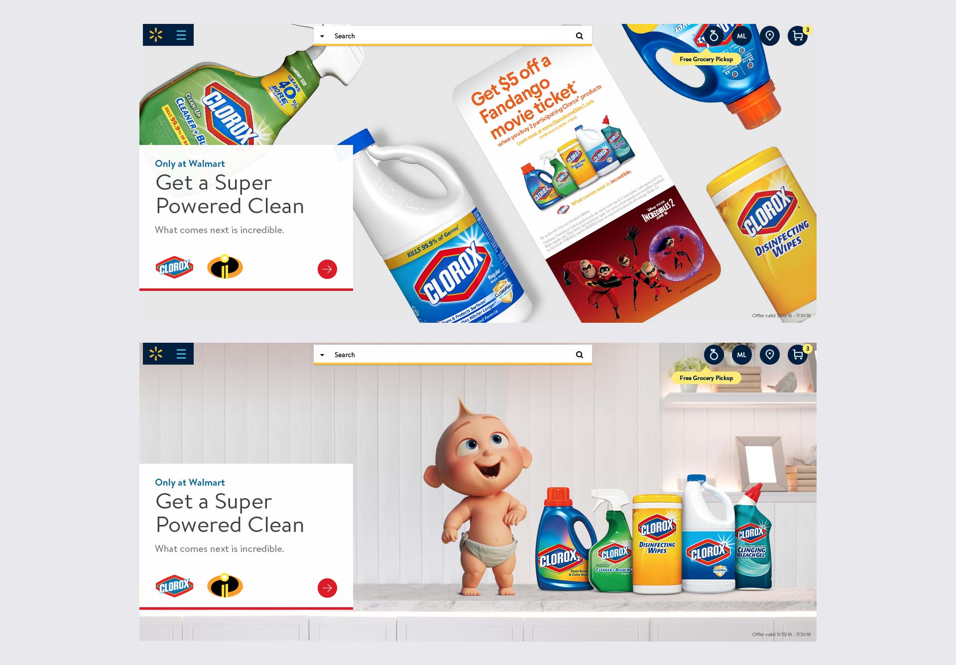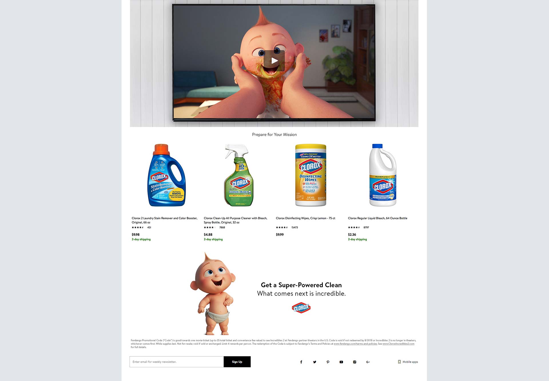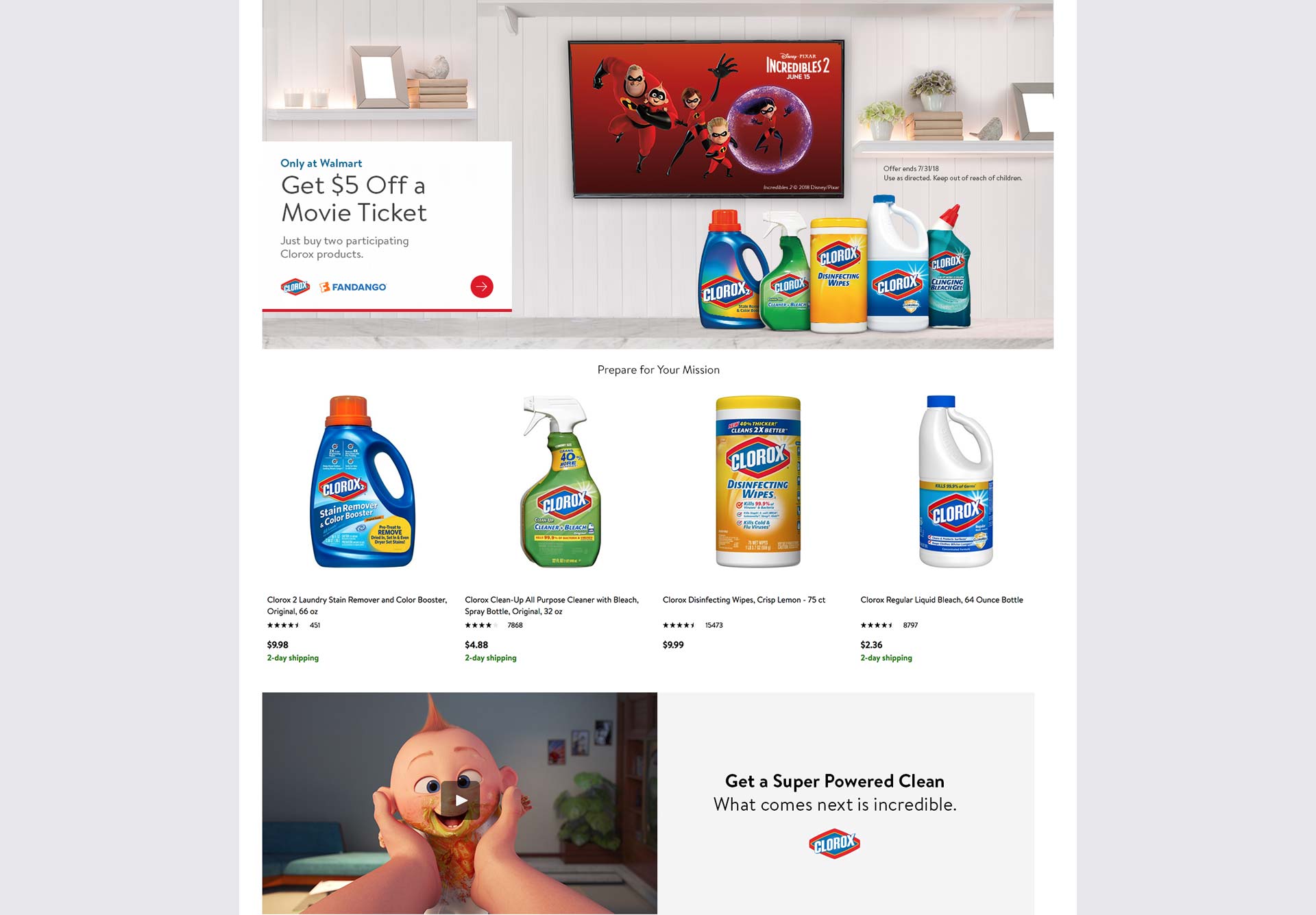 Clorox and Pixar partnered together to promote the new Incredibles movie at Walmart.com. By purchasing 2 participating Clorox products, shoppers could get $5 off their movie ticker through Fandango.